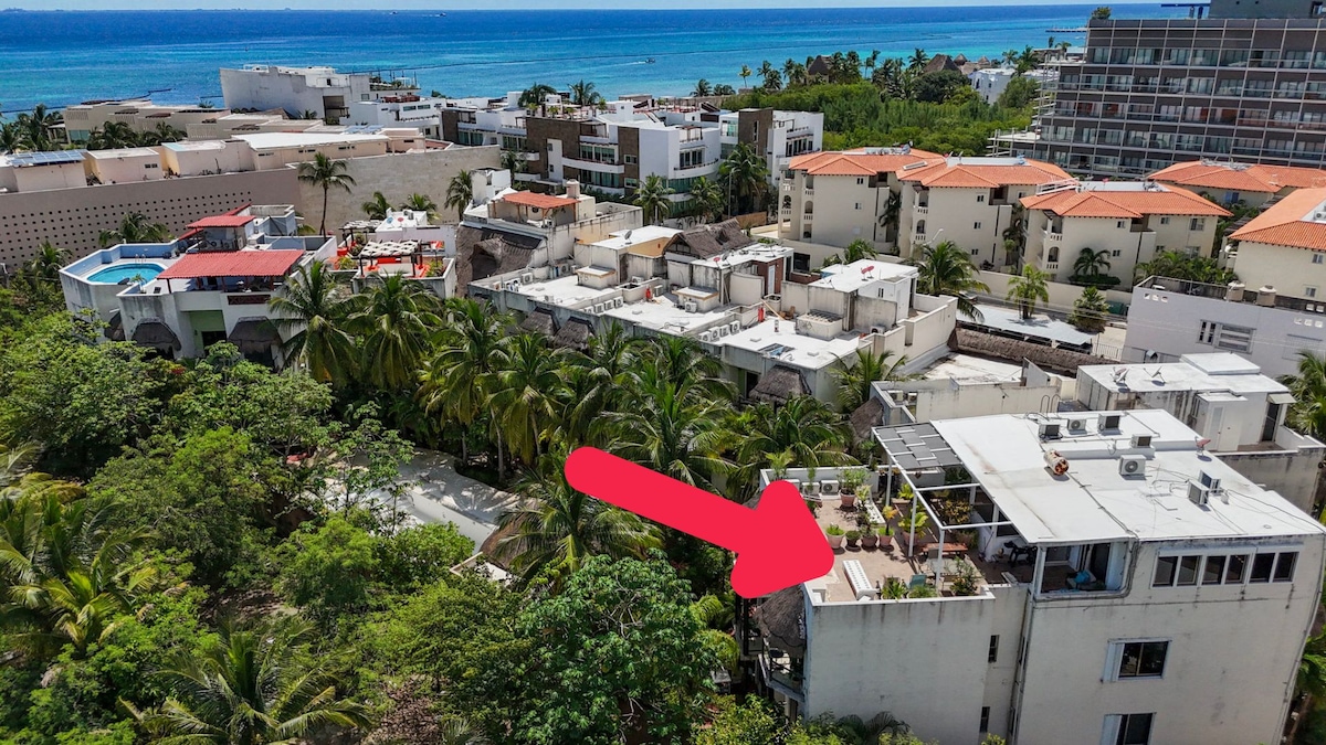 Unbeatable location!!! The Building is On the Beach and this Penthouse has an ocean view from the pool on the private rooftop and tropical street views with palm trees from balcony. Beautiful City view with night lights from the rooftop in the evening. Just remodeled-2023 January- All brand new!!! Located only 2-3 minutes walk from the main part of 5th Avenue where all the best restaurants and shops are and near the popular bars of 12th Street. The best of Playa in walking distance!
