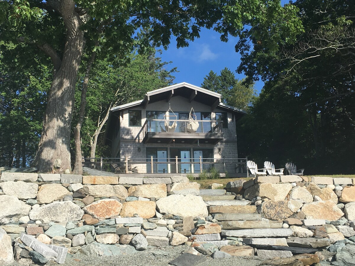 Romantic 2,000-square-foot luxury cottage nestled on twelve acres is a favorite of honeymooners and lovers of modern design * One hour to Acadia National Park & Bar Harbor; 15 minutes to shopping, hiking, swimming * Stargazing deck * 2 full baths, one with steam shower * Fully equipped kitchen with under-counter fridge/freezer * Two gas fireplaces, one indoors, one on a covered deck * Queen bed with luxurious linens and pillows * WIFI, streaming TV, grill, bar * EV charger