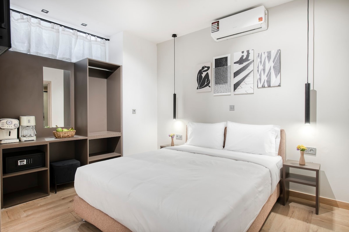 Светлый, комфортабельный номер с чистым современным дизайном и мягкими нейтральными тонами, предлагающий уютное пребывание в центре Афин. К услугам гостей удобная двуспальная кровать, деревянные полы, современная ванная комната с душем, кондиционер, бесплатный Wi-Fi и холодильник для ваших вещей. Большие окна обрамляют вид на город и наполняют комнату естественным светом. Начните свой день с бесплатного кофе в вестибюле и завершите его на крыше с панорамным видом и расслабляющим джакузи.