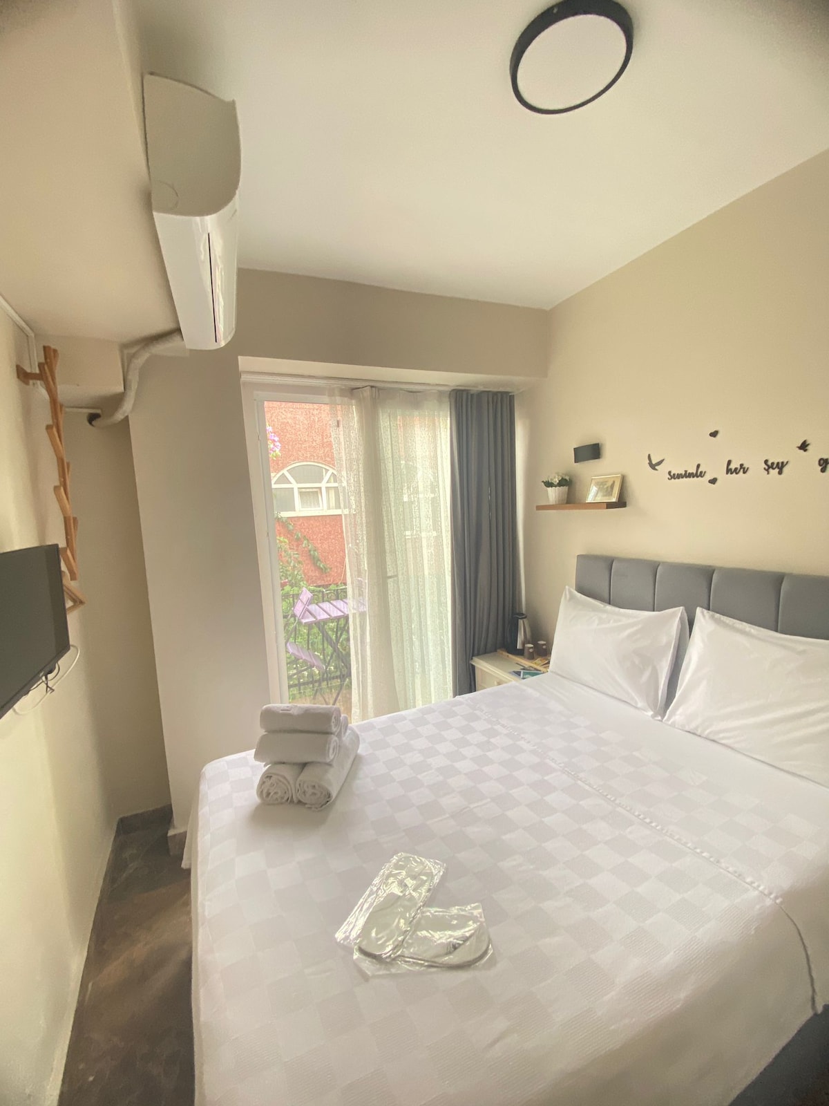 Наша комната с высокими потолками, расположенная на среднем этаже нашего особняка, имеет балкон с частичным видом на море. Эта отдельная комната, где вы можете проснуться с уникальным видом на море, город и остров, ждет вас, ваших уважаемых гостей, для спокойного и комфортного проживания.