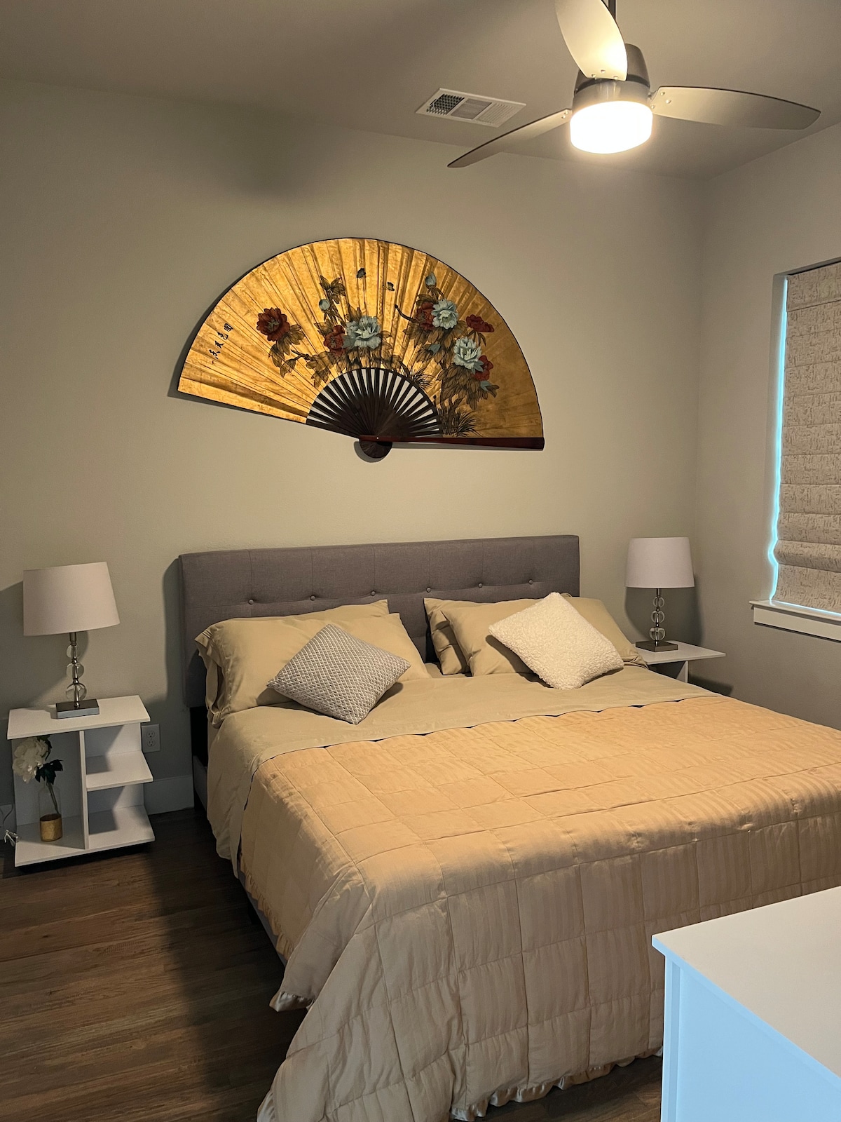 Отдохните и расслабьтесь в этом спокойном, стильном помещении, отдельной комнате с отдельной ванной и кухней, отдельный вход с умным замком. Этот номер похож на гостиничный номер, где пространство используется по максимуму, рассчитан на двух человек, это уютное и практичное место. В ней есть патио у входа, где люди могут курить или отдыхать . Есть двуспальная кровать размера Queen size, место для работы, 50-дюймовый телевизор, микроволновая печь, духовка/тостер , рисоварка, кофеварка, холодильник и фен.
