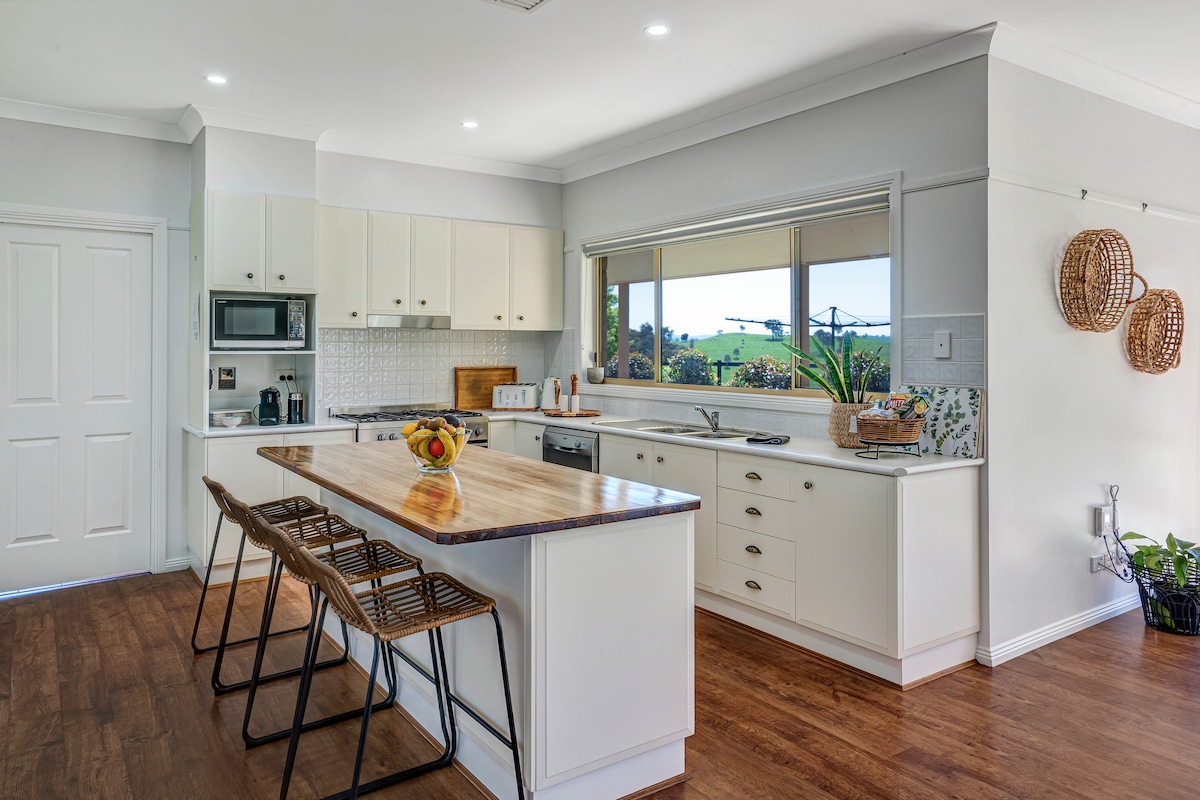 Foxtrotfarmstay is on insta to see a clearer picture of what you will immerse yourself in during your stay. 2 spacious bedrooms, A lux bathroom with free standing bath and a beautiful open-plan kitchen /lounge with magnificent views of folding hills and vast countryside. Unwind and exhale into amazing sunsets with our beautiful Texas long horn cows Jimmy & Rusty or take a walk around the property and explore. Electric blankets on all beds in colder months.AND look out for fox 🦊 on the trot