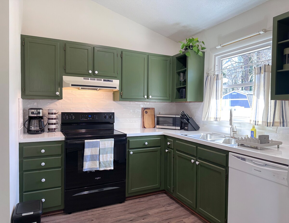 Наслаждайтесь спокойными южными вечерами с переднего крыльца на креслах-качалках и наслаждайтесь завтраком на нашей полностью укомплектованной кухне, включая кофеварку Keurig или графин, горшок, блендер, тостер и микроволновую печь. Столовая в стиле кантри со столом, который расширяется до 8 человек, или обедать на свежем воздухе на террасе заднего двора. Отлично подходит для всех возрастов: настольные игры, игрушки, книги, огороженный двор, Disney+ и Amazon Prime Video. В гостиной и спальне с кроватью размера «king-size» есть телевизор.