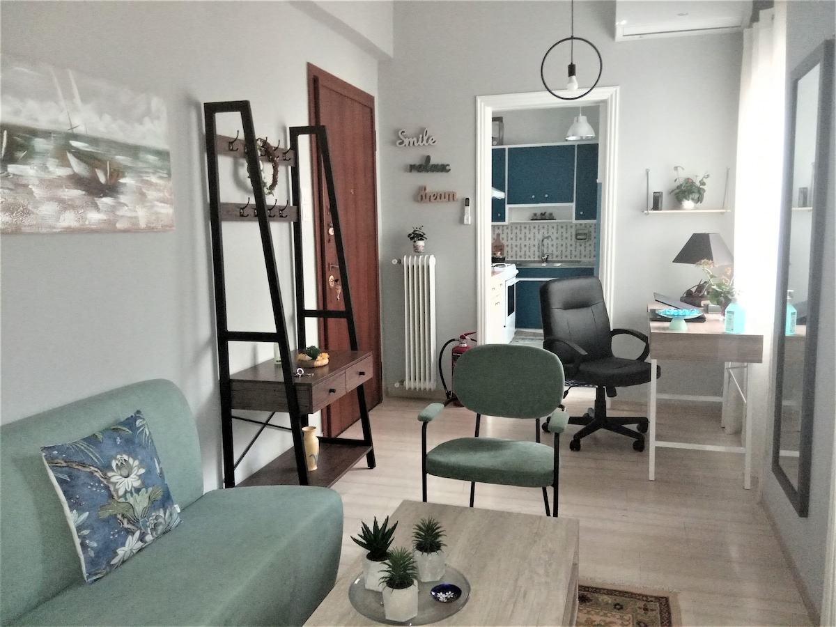 A warm, inviting apartment with a striking teal sofa and plenty of plants to bring calm and character. Includes a large Smart TV, fully equipped kitchen essentials, and strong Wi-Fi. Perfect for couples or solo travelers seeking comfort and convenience. Located just a 7-minute walk from the Metro, this is an ideal Athens stay with relaxing design and excellent transport connections.