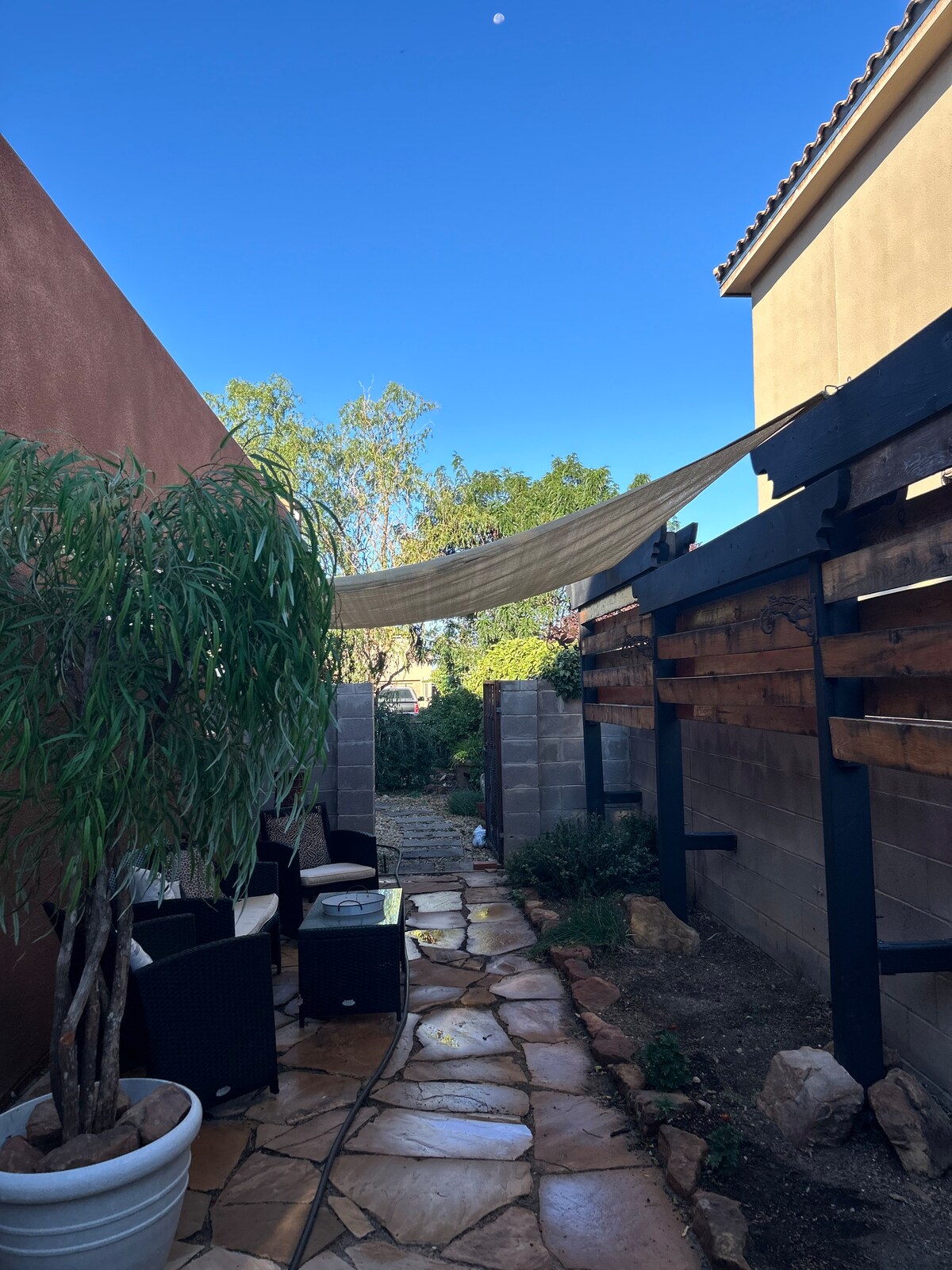 Welcome to your stylish Santa Fe hideaway — a modern, private adobe studio designed for comfort, creativity, and connection. 🛏 Iron Tree Bed with star-lit branches 🚿 Luxury spa shower for two 📺 70” TV for cozy movie nights ❄️ A/C + fast Wi-Fi 🍳 Kitchenette with essentials 🔑 Private entrance + smart lock Perfect for couples, weekend escapes, Meow Wolf adventures, and anyone wanting a calm, beautifully designed space in vibrant Midtown.