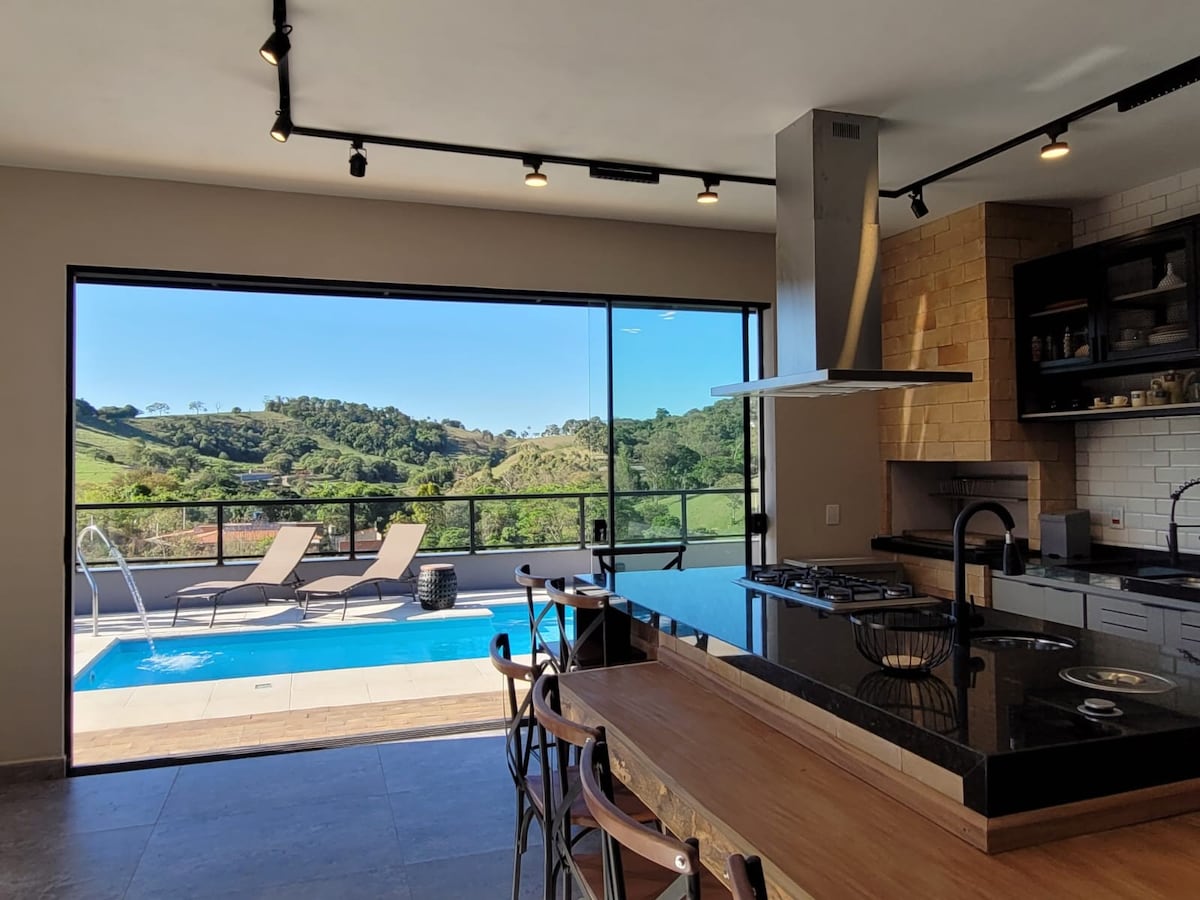 Casa modelo rústico com arvores ao redor, churrasqueira com vista para a natureza, um deck de frente para as montanhas e lago, por ser um local rural as folhas em seus detalhes fazem a decoração, piscina com privacidade e uma trilha ecológica com escada de pneus super atrativa. temos o cuidado de manter todo o espaço dedetizado conforme certificado apresentado da parede da cozinha.