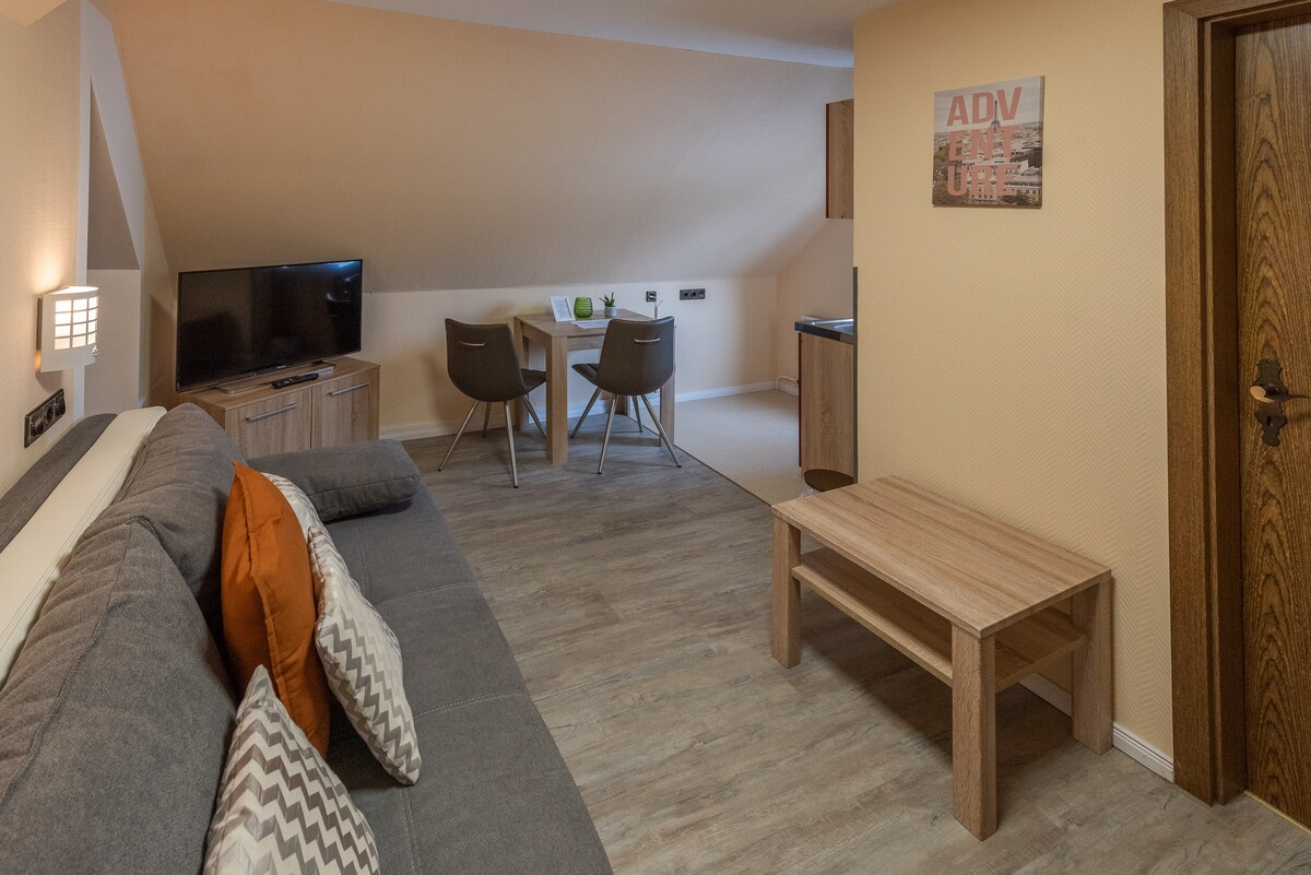 Наша полностью отремонтированная и современная меблированная однокомнатная квартира предлагает вам все необходимое для комфортного и спокойного отдыха в небольшом пространстве – идеально подходит для пар, одиночных путешественников или деловых путешественников. Совмещенная гостиная и спальная зона светлая и уютная. Через большую створчатую дверь можно выйти на небольшую террасу, где можно наслаждаться солнцем с видом на Верхний замок. 🏰