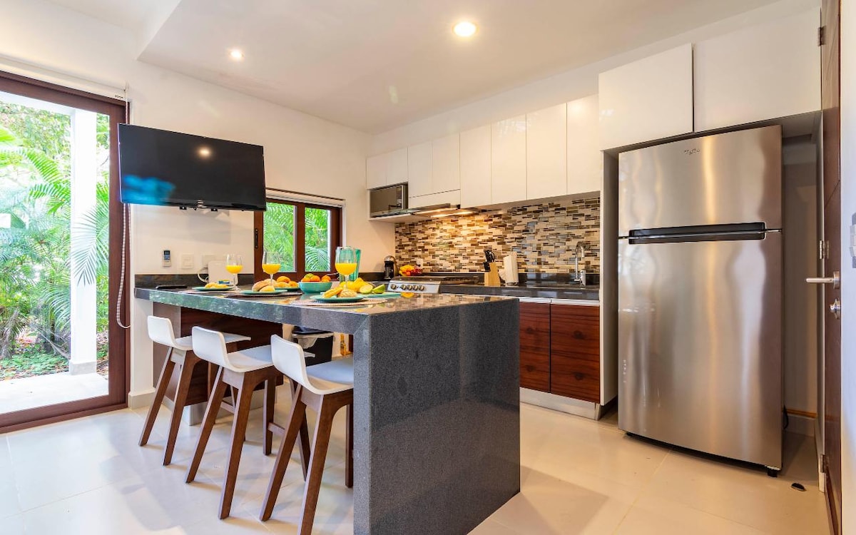Современная пляжная квартира в заливе Халф-Мун-Бэй в Акумале с 2 спальнями, 2 ванными комнатами, собственным патио и прямым видом на океан. Наслаждайтесь бассейном на берегу моря, обедом на свежем воздухе и открытой гостиной, наполненной естественным светом. Кондиционер в спальнях и гостиной, полностью оборудованная кухня и Wi-Fi. Прогуляйтесь до местных ресторанов, лагуны Ял-Ку и залива Акумаль, чтобы заняться сноркелингом и поплавать с морскими черепахами. Идеально подходит для пар, семей или друзей, ищущих шикарный и комфортабельный отдых на пляже.