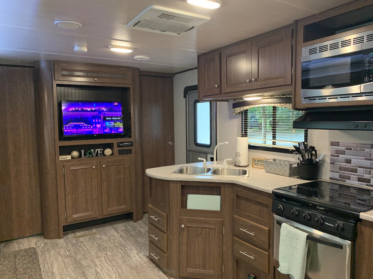 Насладитесь спокойной ночью вдали от занятой жизни на нашей ферме. В нашем 34-футовом автодоме есть 1 спальня с двуспальной кроватью размера Queen size, ванная комната, полностью оборудованная кухня, гостиная с диваном и футоном, который складывается до полноразмерной кровати, стол на 4 места, телевизор и DVD-плеер. С собственной террасой, обращенной на запад к пруду, вы можете наслаждаться прекрасными закатами и звуками наших животных вокруг вас. Обратите внимание, в отпуске нет Wi-Fi или кабельного телевидения. До сих пор у всех был хороший сигнал сотовой связи.