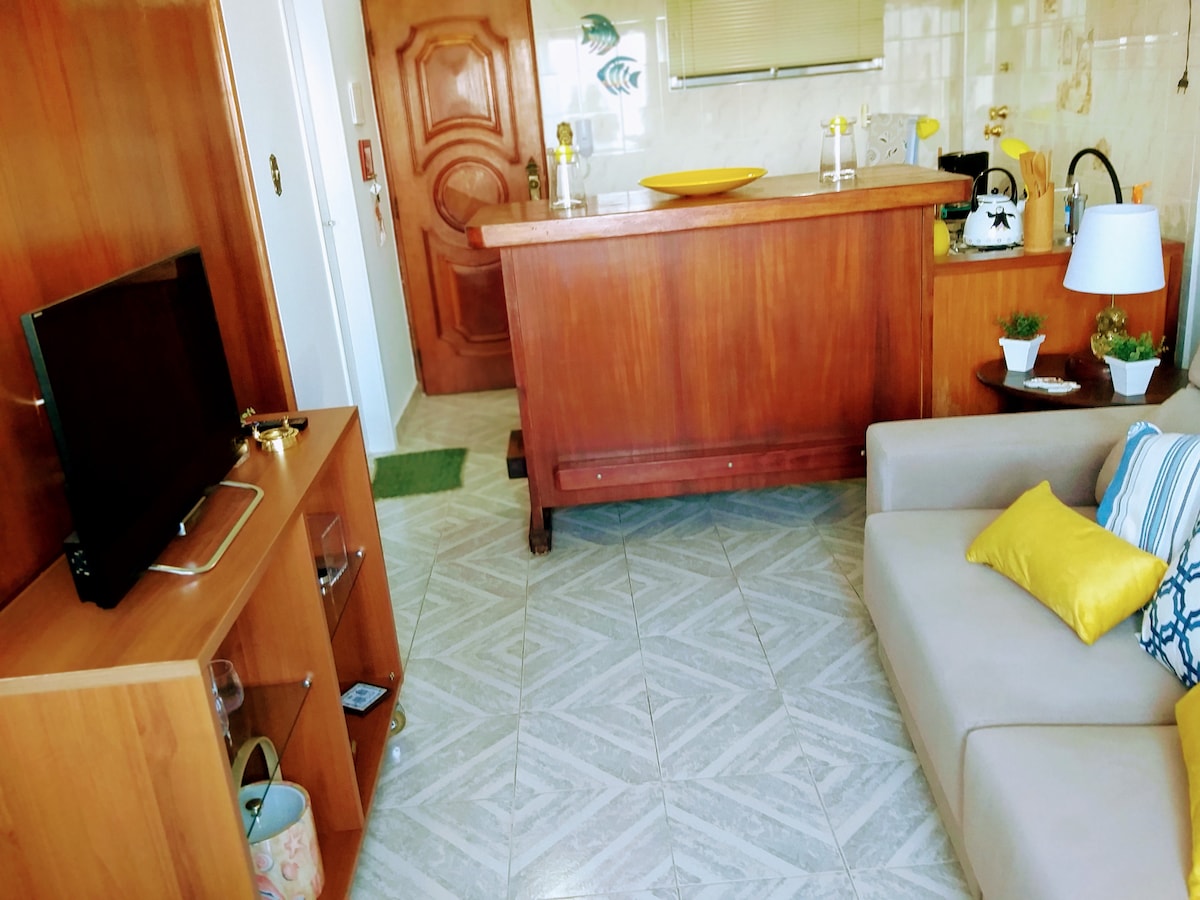 Venha sentir a experiência de se hospedar sobre o mar, com uma vista incrível, num apartamento aconchegante, confortável, limpo, seguro e completo, com tudo o que você precisa para relaxar e ficar apreciando a vista da janela. Localizado no topo da Ilha Porchat, em SV. Apto com ar condicionado, cama box casal, sofá cama, Smart TV com acesso ao Netflix, internet de alta velocidade, cozinha completa com todos os utensílios necessários para preparar refeições, e curtir a paz e tranquilidade.