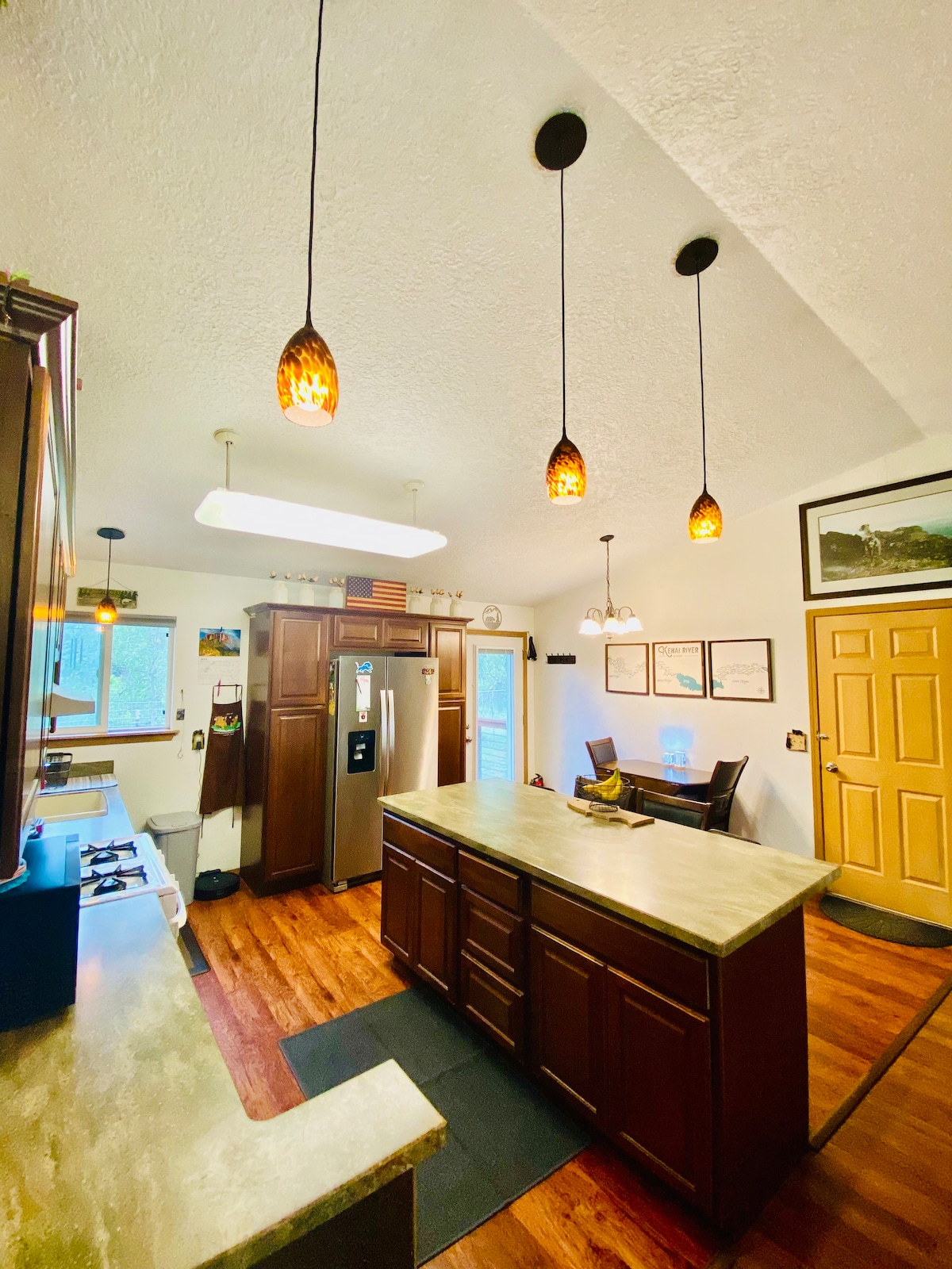 Красивый дом в аляскинском стиле. В окружении деревьев площадью более половины акра. Большая терраса для барбекю-гриль и костровая яма, чтобы насладиться атмосферой. В этом прекрасном доме с четырьмя спальнями могут комфортно разместиться восемь человек. Мы готовы принять еще несколько гостей с уведомлением о дополнительных гостях. Мы приветствуем вечеринки/праздники, дни рождения и т. д. Дом и кухня полностью обставлены всем необходимым, чтобы вы почувствовали себя как дома. Свяжитесь с нами, чтобы узнать о сезонных скидках и жилье.
