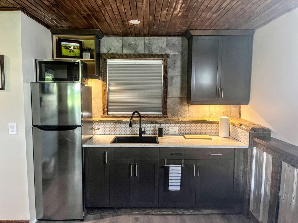 Start your day with a homemade breakfast delivered to your door or prepared at your leisure with ingredients provided. Spend your day exploring the famous Rocky Mountains or walking to Cochrane's historic downtown, then snuggle up by the fireplace or bask on the garden-side patio at this exceptionally-crafted, intimate oasis. The tiny house is situated in our large backyard and has been designed for everyone's privacy, including your own sidewalk that connects you to your parking.