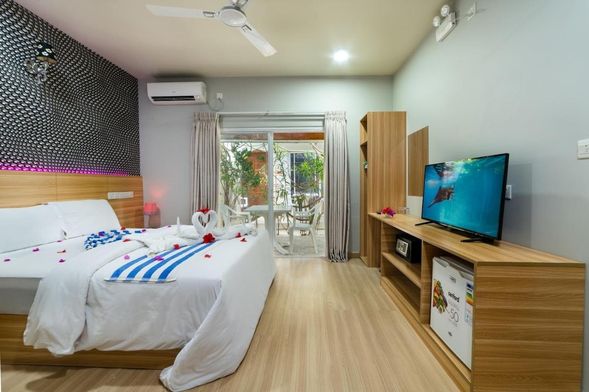 Relax in our stylish Deluxe Room featuring a comfortable king-size bed, modern amenities, and a private balcony overlooking lush tropical greenery. Enjoy the fresh island breeze, plenty of natural light, and a peaceful atmosphere perfect for unwinding after a day at the beach. Ideal for couples or small families looking for comfort and a touch of nature during their stay in Thoddoo.