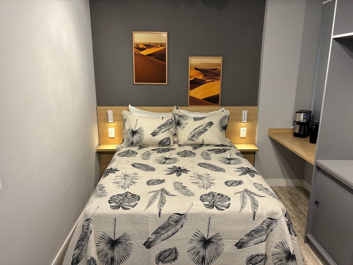 Студия расположена в отеле Plaza Inn American Loft (современный с отличными отзывами). Жилье расположено напротив парка Allianz Parque и торгового центра Shopping Bourbon, а также недалеко от клиники Unimed Space, Villa Country, баров и ресторанов. Служба сообщений, парковочное место, бассейн и тренажерный зал на крыше, ресторан, прачечная и два рабочих места. Жилье: 33 м, чисто, кондиционер, обеденный стол, большой шкаф, двуспальная кровать, выдвижной диван, телевизор, затемняющая штора, кухня и ванная комната.