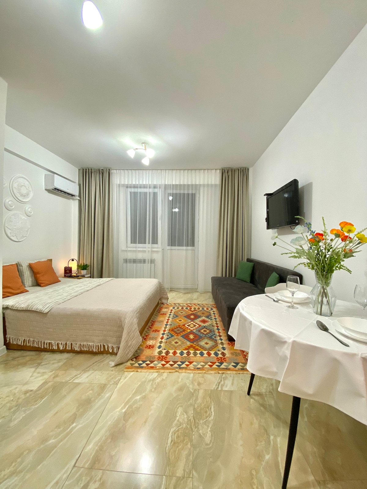 Cozy apartment in the city center with mountain view. Чистая и уютная квартира-студия на 13 этаже в тихом районе центра города. С балкона открывается шикарный вид на горы: утром можно встретить день с чашкой кофе, а вечером наслаждаться огнями оживлённого города. Интерьер в спокойных тонах создаёт атмосферу уюта и гармонии, а кухня-студия позволит приготовить любимые блюда. Квартира отличается идеальной чистотой, свежим постельным бельём и продуманным комфортом для вашего проживания.