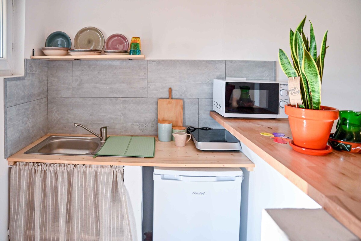 Студия площадью 50 кв. м, терраса включена. Отдельное жилье. Спальня с двуспальной кроватью, большим шкафом, диваном, офисом (холодильник, микроволновая печь, кофемашина и тостер) и полностью оборудованной ванной комнатой. Внутри нет удобств для приготовления огня, но барбекю снаружи для приготовления пищи. Идеально для двоих. Тихий центральный район с хорошим транспортным сообщением, всеми услугами, множеством типичных баров и ресторанов под рукой. С удовольствием предоставлю информацию об этом. Морской берег: 3 минуты пешком / город/исторический центр: 15 минут пешком.