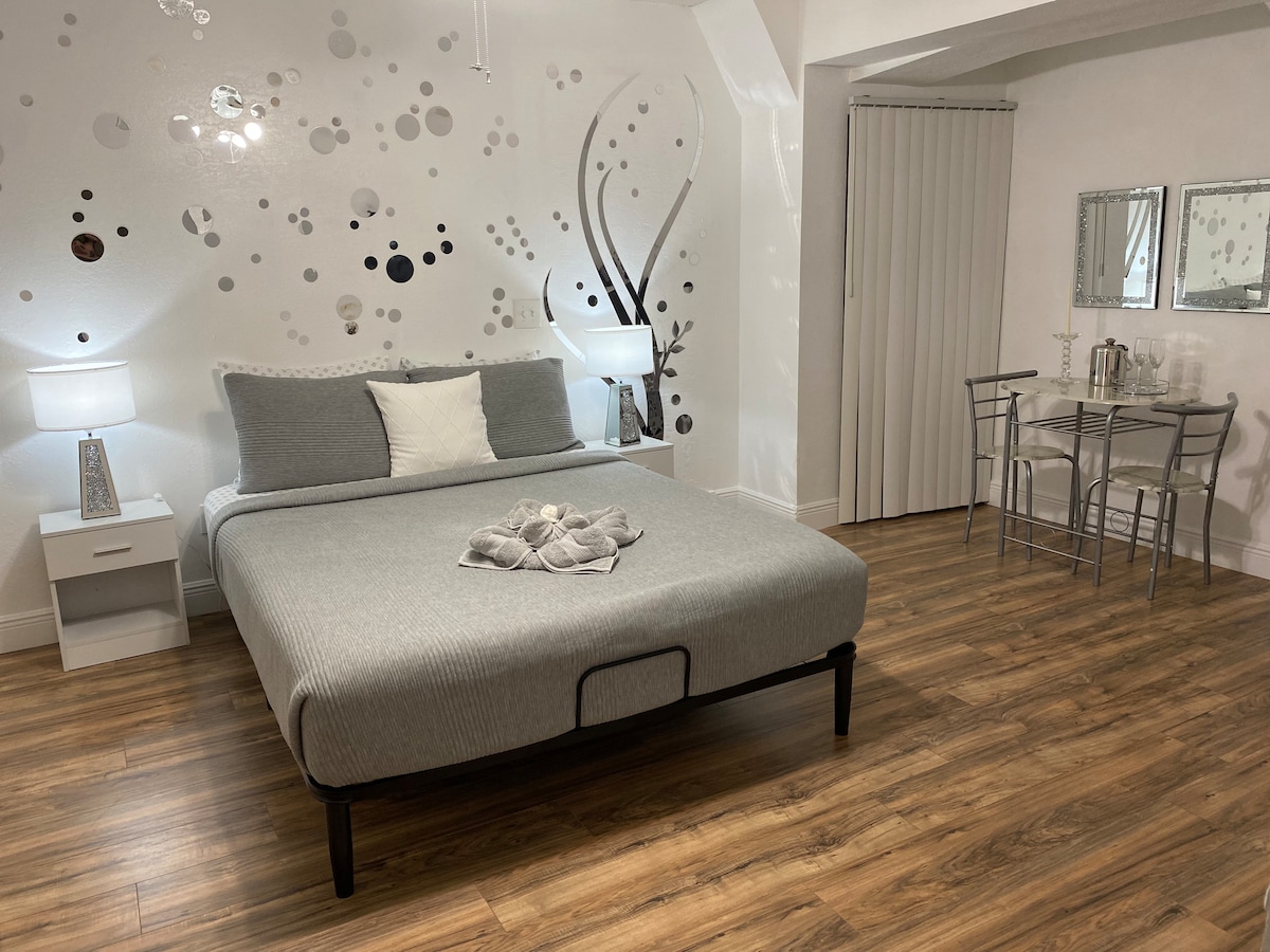 Отдельный и комфортабельный люкс с 1 спальней/ванной комнатой в таунхаусе 2021 года с окнами с видом на фасад, кроватью размера Queen size, душевой кабиной и отдельным входом. Оснащен потолочными и портативными вентиляторами, смарт-телевизором Roku, мини-холодильником/морозильной камерой, микроволновой печью и кофемашиной Keurig. Расположен в безопасном, тихом, пешеходном районе. 5 минут до магазинов College Park, 10 минут до центра Орландо, 25 минут до Universal Studios, 30 минут до международного аэропорта Орландо и 40 минут до Диснея.