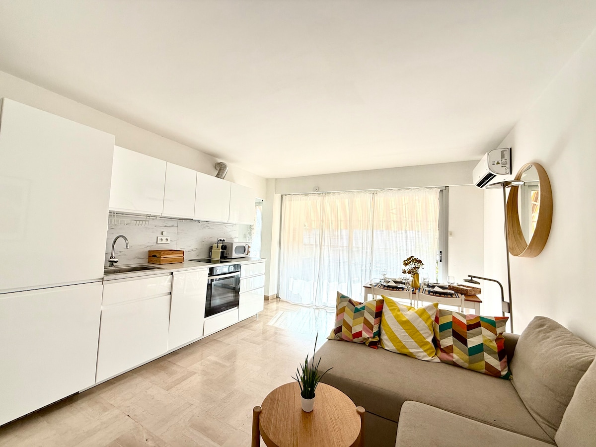 A modern apartment in Antibes Juin les Pins, in the heart of the Cote d'Azur, offers easy access to all amenities. Close to beaches, restaurants and train station. This renovated accommodation, air-conditioned, with a bedroom with a double bed, a living room with a fully equipped open kitchen, dining area for 4 people and a sofa bed. A modern bathroom with shower, toilet, washing machine. Free parking space on the streets around. A beautiful terrace, arranged to enjoy the good weather outdoors.