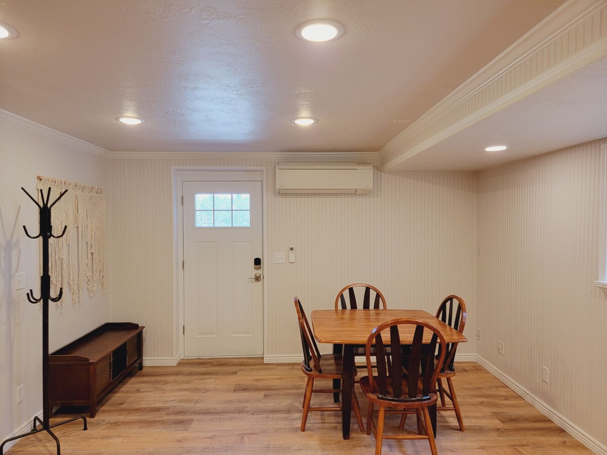 Квартира на цокольном этаже с 2 спальнями, 2 кроватями размера King size, отдельным гостевым входом и внеуличной парковкой. 65" Roku TV с объемным звуком. Работайте удаленно с оптоволоконным интернетом и рабочими станциями. Открытая кухня с полноразмерной плитой, холодильником, посудомоечной машиной. Термостат с контролем гостя. Комбинация стиральной и сушильной машины. Рядом с лыжами и пешими прогулками в каньонах Коттонвуд: 20 минут до Альта/Снежной птицы, 30 минут до Solitude/ Brighton. Детский манеж по запросу. Скидка 10% при проживании более 7 ночей. Плата за уборку 70 долларов за весь период проживания.