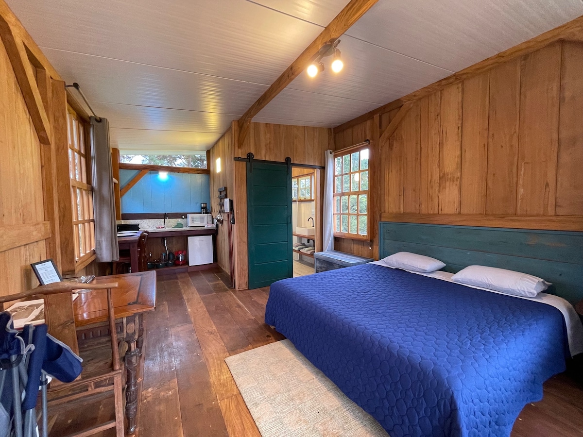 🤩NOVO! 🌿Viva o luxo do simples !!! A Cabana Encantada é um refúgio romântico entre pinheiros🌲, com lareira🔥e banheira🛁 para momentos de puro relaxamento. Pensada para casais, combina privacidade, conforto e uma atmosfera acolhedora. A iluminação quente, o design em madeira e a vista para a natureza criam o cenário ideal para desacelerar. Com cozinha equipada e ambiente silencioso, é perfeita para viver dias especiais e memoráveis.🌿