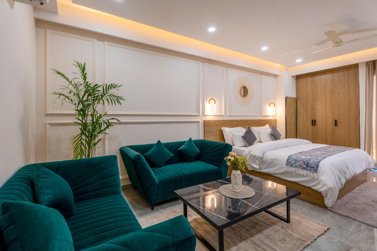 Апартаменты премиум-класса 1BHK в секторе 43, Гургаон с кондиционером в гостиной и спальне, а также мини-кухней с индукционной плитой, микроволновой печью и столовыми приборами. В шикарном районе, в пешей доступности от торгового центра Gold Souk и школы Shalom Hills, в 2,2 км от станции метро Millennium City Centre и в 2,1 км от больницы Fortis. Приветствуются иностранные гости. Раннее прибытие возможно при наличии свободных дат и за дополнительную плату в размере 500 рупий, поздний выезд также возможен за дополнительную плату в размере 500 рупий за каждые 3 часа.