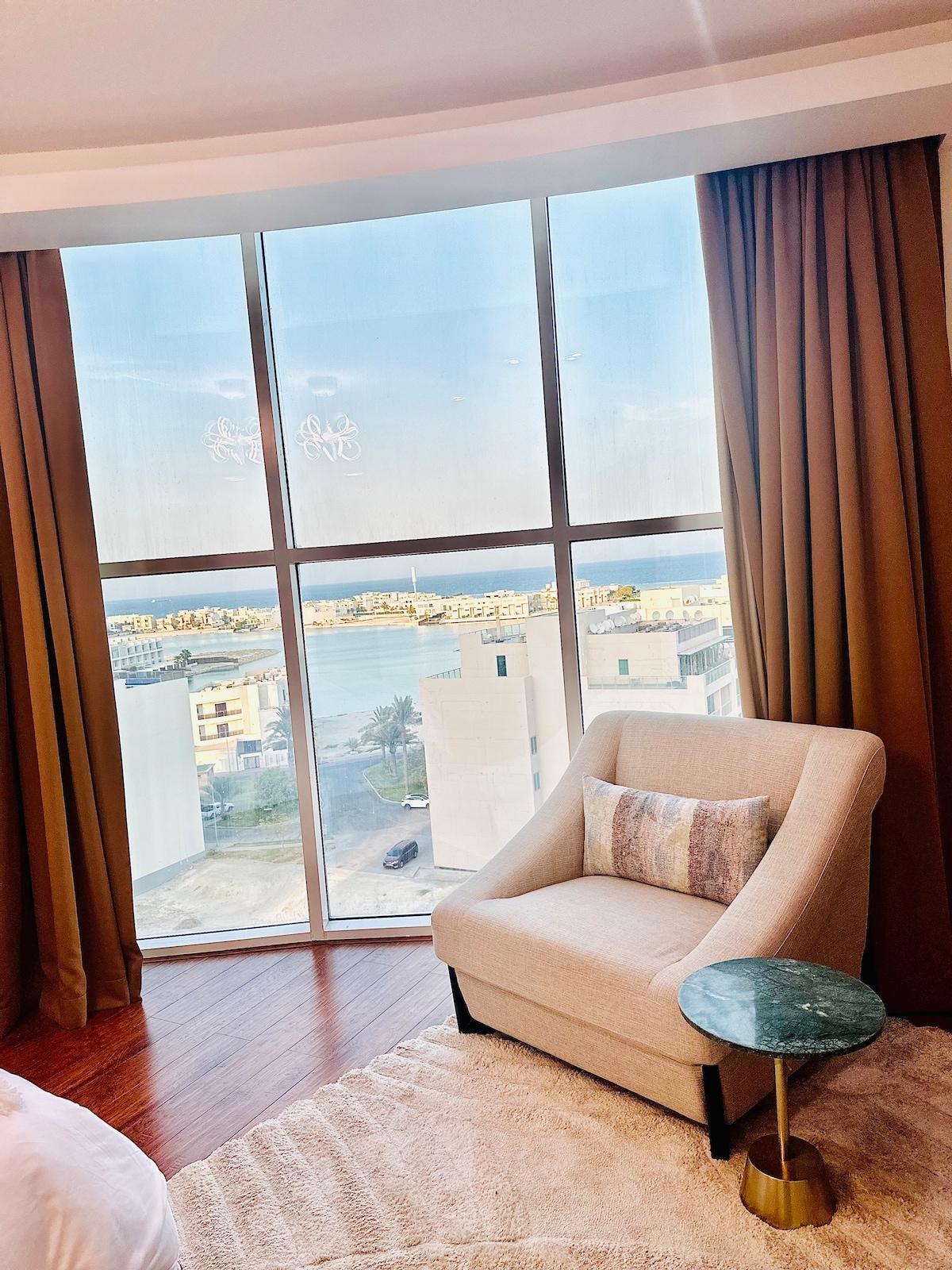 Experience the ultimate in luxury at the Luxe city View Studio, where breathtaking views of the sea and Marassi Beach greet you as soon as you enter. Enjoy a sophisticated living space, featuring a beautifully designed living room and top-tier amenities. Step out onto your private balcony for stunning views that stretch all the way to the horizon, making your stay truly unforgettable.