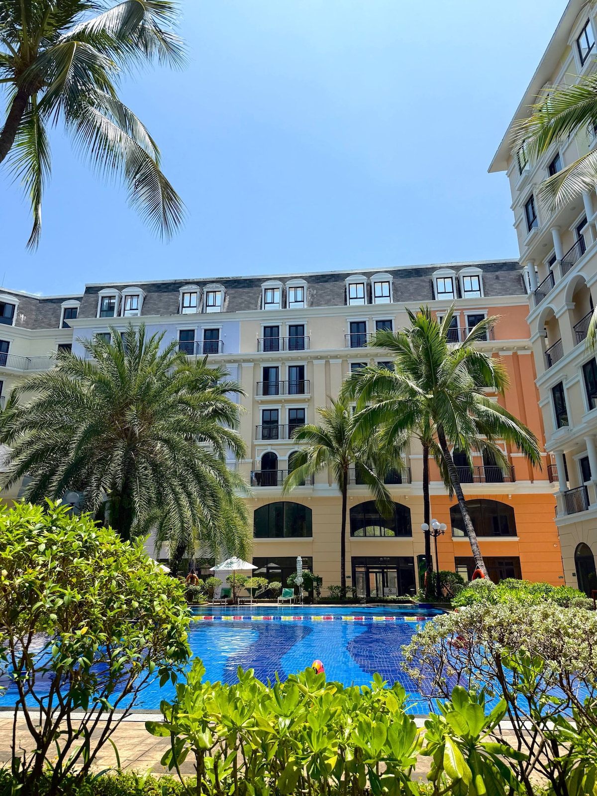 КОМНАТА: — В помещении площадью 33 м² есть 2 открытых окна. - 2 кровати размером 1 м4x2 м. - Хорошо оборудованный всеми удобствами: кондиционер, телевизор, вентилятор, рабочий стол, шкаф, высокоскоростной Wi-Fi. - Собственная ванная комната и туалет. УДОБСТВА ОБЩЕГО ПОЛЬЗОВАНИЯ: - 5-звездочный пляж в 300 метрах. - 3 больших бассейна площадью 3000 кв. м бесплатно для гостей. — В открытом курортном комплексе Marina много зеленых деревьев и цветов.