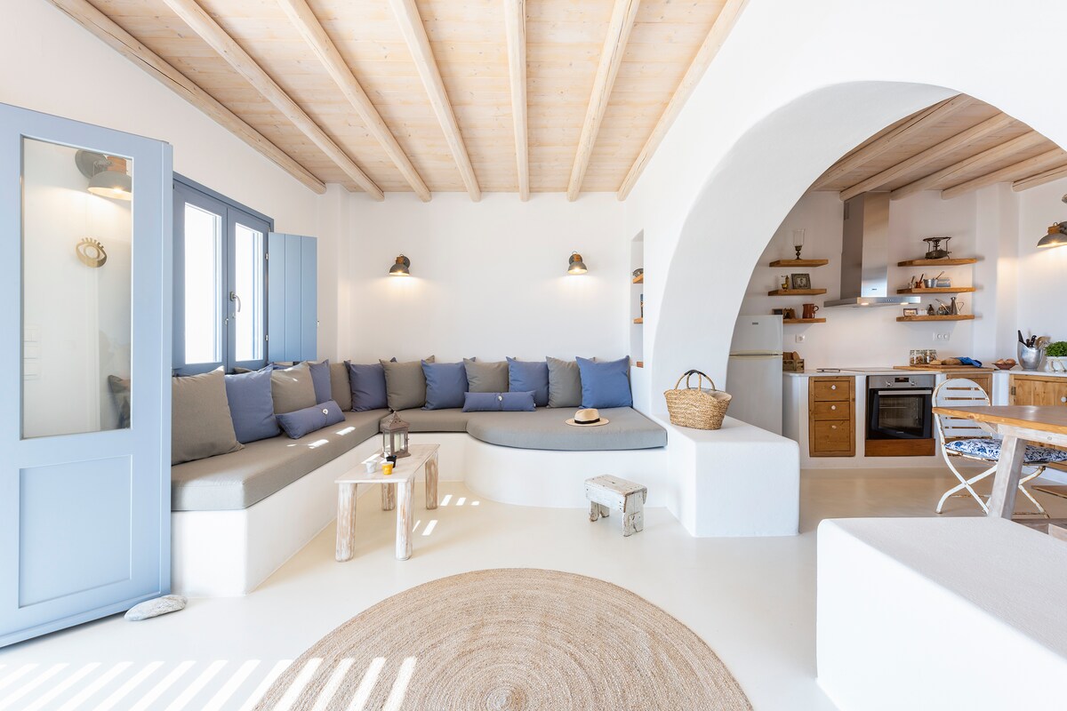 Наш традиционный кикладский каменный дом (65 кв. м) расположен в центре деревни и имеет прекрасный сад с лимонными, апельсиновыми, гранатовыми, абрикосовыми, авокадо и виноградными деревьями, где можно расслабиться и насладиться природой. Из квартиры открывается панорамный вид на деревню и захватывающий вид на море на остров Наксос. Дом экологичен,подходит для работы и имеет солнечную энергию. Wi-Fi также надежен для работы. Мы принимаем длительное проживание. Все, что вам нужно, находится в 20 метрах пешком.