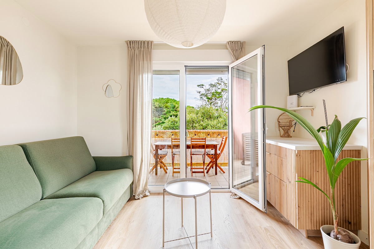 Красивая квартира площадью 42 кв. м с одной спальней, полностью отремонтированная архитектором. Современный, комфортабельный и светлый с большой террасой площадью 15 кв. м с западной/юго-западной стороны. Полностью оборудованное и идеально расположенное (пляжи, поля для гольфа, Биарриц, Байонна...), чтобы насладиться баскским побережьем и его землей, как пара или семья. Также приветствуются люди, путешествующие по работе.