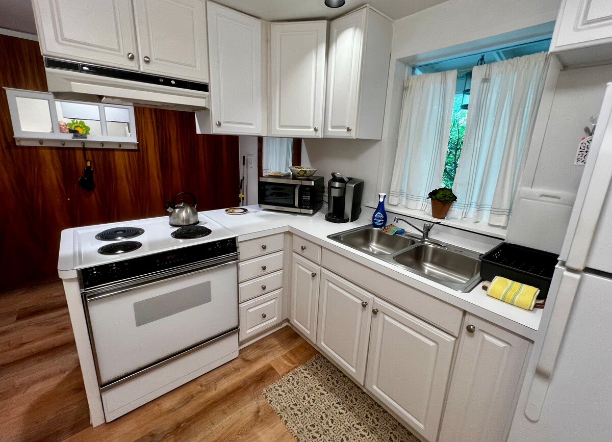 Это частный гостевой люкс (ПОЛНЫЙ нижний уровень прогулки - около 1750 кв. футов) в нашем более крупном трехэтажном жилье. Комфортабельный дом с 2 спальнями, 1 полной ванной, гостиной и кухней с фриком, посудомоечной машиной, кофеваркой, электрической плиткой, тостером, микроволновой печью и прилавком на 6 мест. Новые матрасы, постельное белье, подушки и полотенца. Гости могут пользоваться задним патио с естественным костровищем, крытым павильоном с газовым камином, грилем и джакузи. Отличные Wi-Fi и Smart TV.