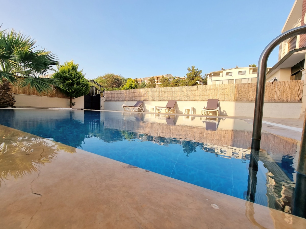 Наша просторная квартира 2+1 на верхнем этаже с частным бассейном и панорамным видом на море из каждой комнаты ждет вас в Кызылбуруне, между Ялыкаваком и Гюндоганом. В безопасном и тихом месте, в спокойном месте, где можно расслабиться, наблюдая за уникальными закатами.