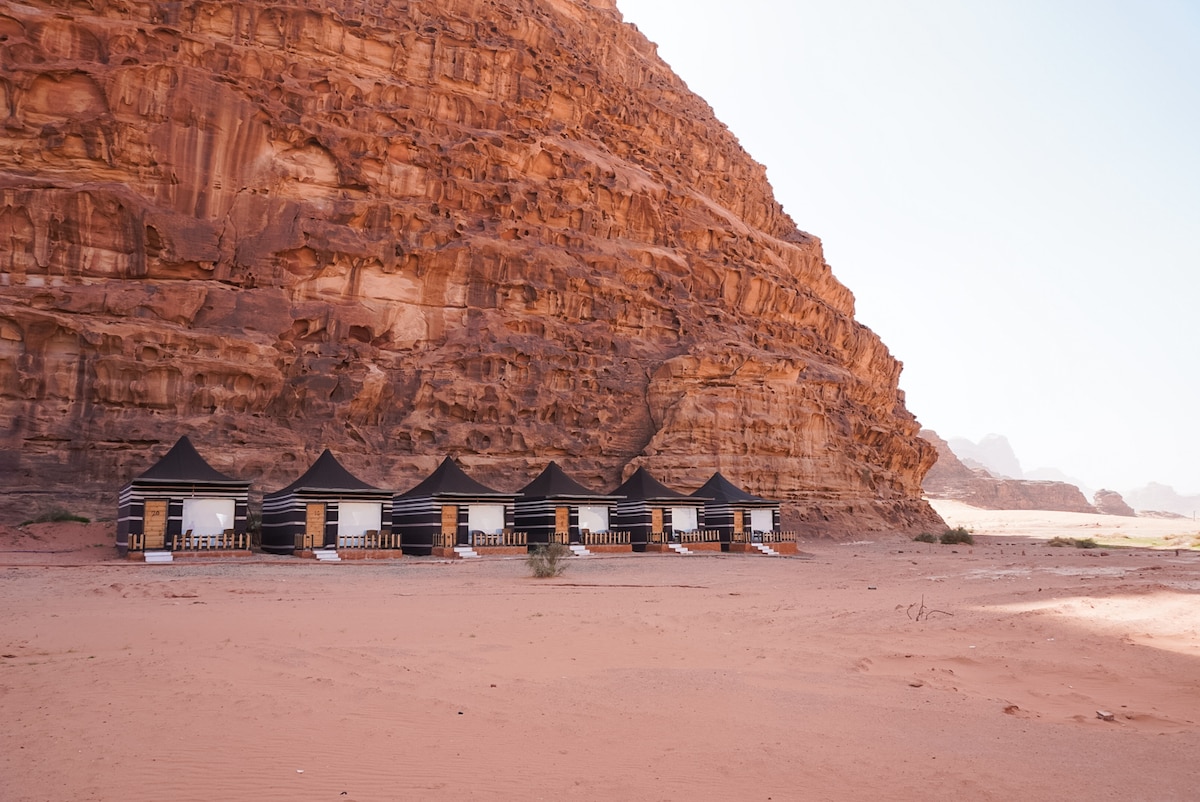 Лагерь расположен в центре пустыни Вади-Рам между горами и красными песчаными дюнами. Есть место для заката и заката