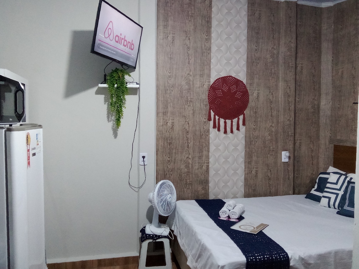 Localizado em bairro seguro e tranquilo, com fácil acesso às principais rodovias para acessar a cidade e comodidades, como academia, supermercados e farmácias. - Quarto com cama de casal, ar condicionado, armários planejados, TV. - Sala com sofá cama, TV, ar condicionado. - Cozinha/lavanderia: armários planejados, fogão, geladeira, filtro anexado à torneira, microondas e utensílios básicos (copos, pratos, talheres e panelas). Obs. Não aceitamos animais de estimação no espaço.