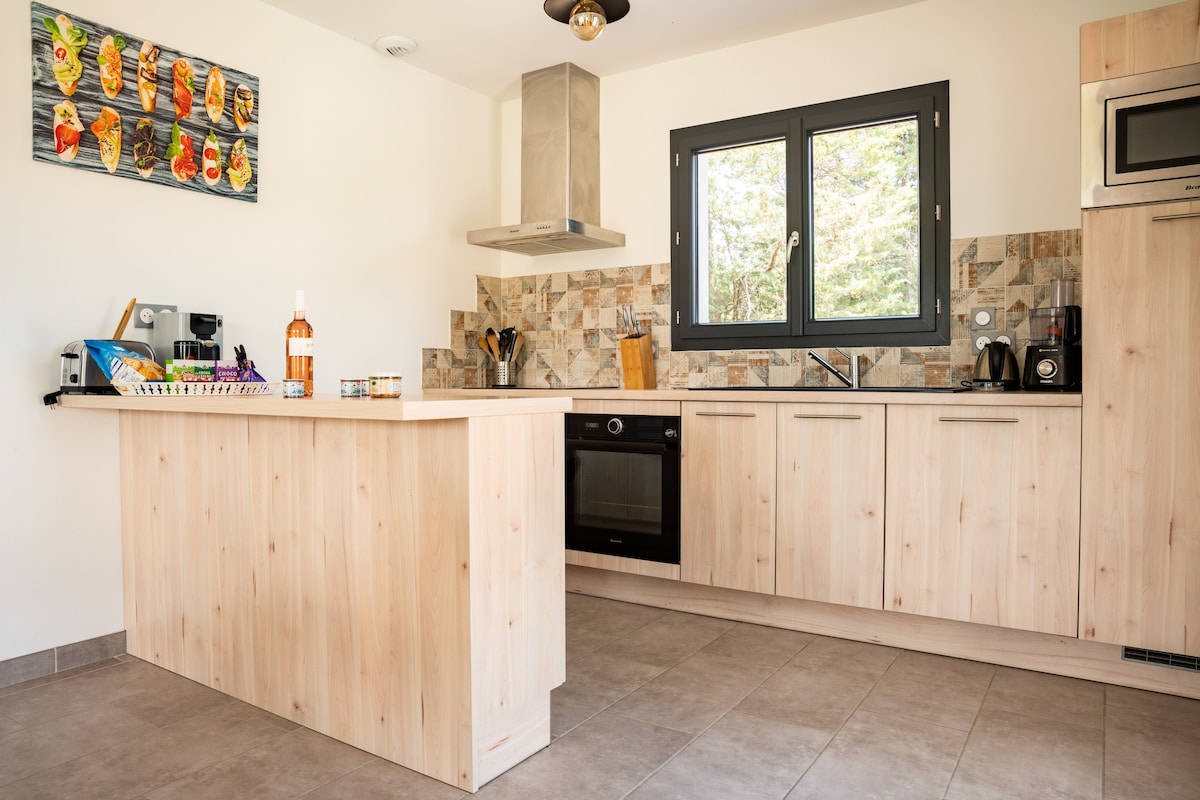 Четырехзвездочное оборудованное туристическое жилье: 65 м2 в зеленой обстановке. С собственной террасы открывается вид на лес дубов и сосен с видом на холмы. Спальня с большой кроватью (качество гостиницы) и прилегающей ванной комнатой + полностью оборудованная открытая кухня с видом на гостиную с 2 односпальными диванами-кроватями. Полноценное оборудование, бассейн используется совместно с владельцами. Мы с удовольствием поговорим с нужными адресами в этом районе, если гости захотят.