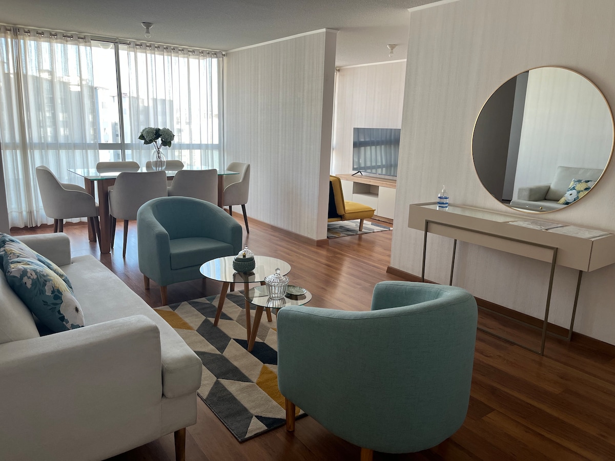 Ваша семья будет близко ко всему, когда вы остановитесь в этом доме, расположенном в центре города. Премьерная квартира площадью 110 кв. м. Удобно и тихо. К услугам гостей клубный дом (бассейн, бильярд, тренажерный зал, рекреационные игры, фулбито-Канчита). 10 минут до торгового центра Real Plaza, Real Plaza y Arequipa Center. 10 минут до площади Арекипы Пласа-де-Армас. Винодельни и мини-маркеты поблизости. Рядом безопасные таксопарки.