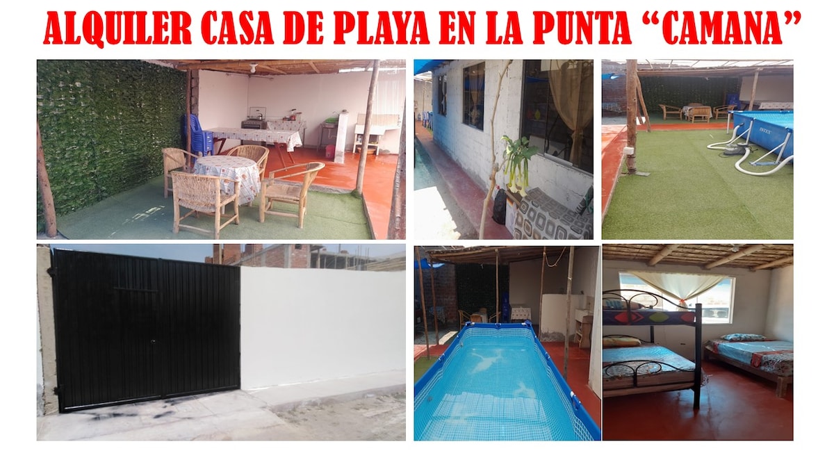 Casa de playa La Punta Camaná, 3 habitaciones 9 camas, 2 baños, cocina comedor, piscina estructural de 5x2.5, techada, cochera 2 carros, área parrilla, tv cable, totalmente amoblada, tanque elevado agua 24hs.