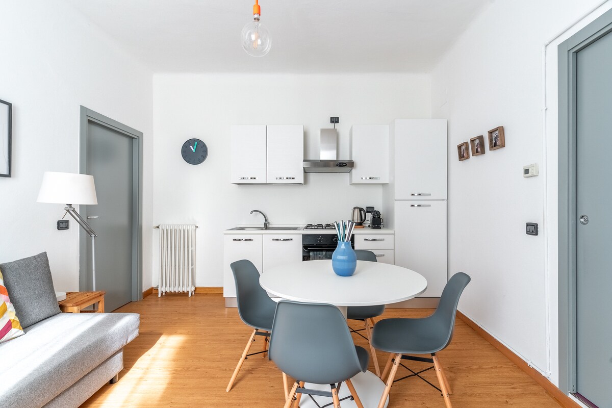 Светлая и уютная дизайнерская двухкомнатная квартира на втором этаже (без лифта, первый этаж в Италии — это нулевой этаж) типичного миланского дома начала 1900-х годов. Элегантные и комфортабельные апартаменты, в районе, где проводятся Salone del Mobile, Неделя моды и многие другие культурные мероприятия, рестораны (в том числе отмеченные звездами) и ночная жизнь (Навильи в шаговой доступности). Трамваи, метро и услуги (супермаркеты, аптеки, магазины и т. д.) находятся в непосредственной близости.