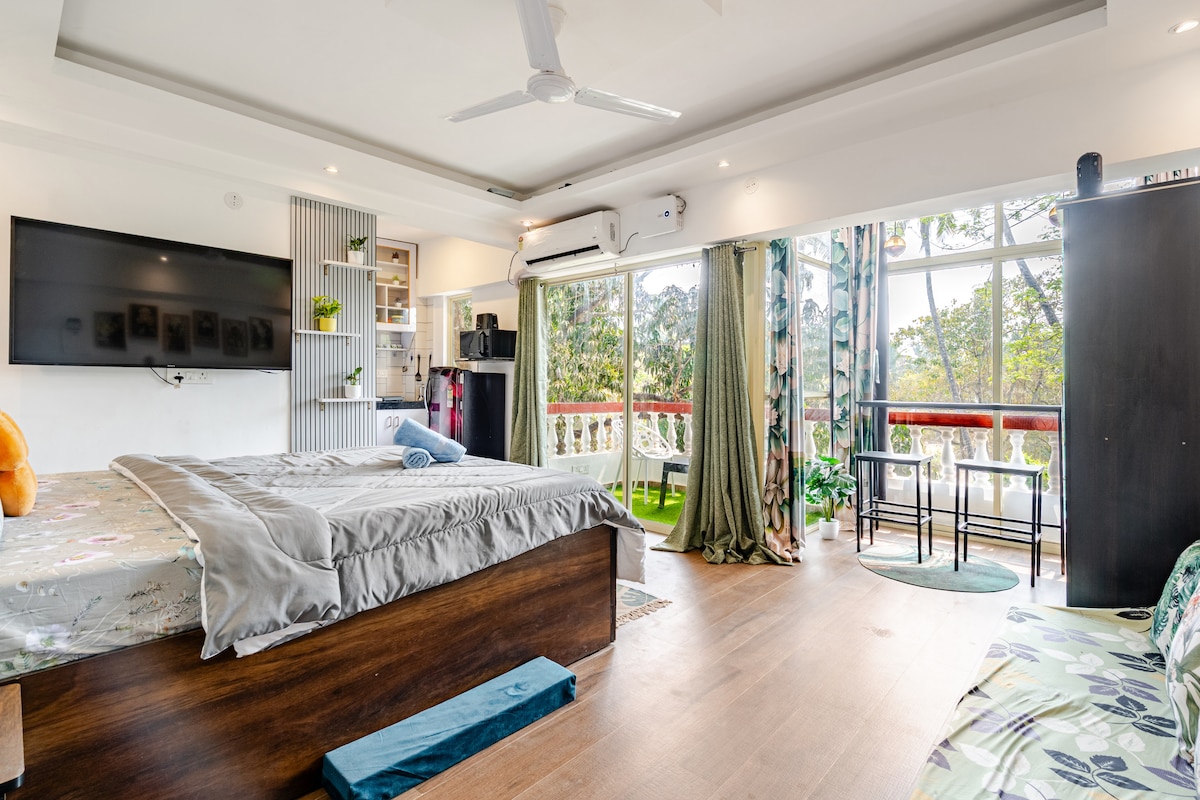 Cozy studio apartment in Arpora- minutes from Baga,Anjuna&more Balcony,pool access,kitchen & peaceful vibes This modern space offers all the comforts you need: a 55-inch TV, fridge, AC, high-speed Wi-Fi, microwave, and a fully equipped kitchen. Enjoy the serene forest view and lush greenery that surrounds the property. Take a refreshing dip in the pool or unwind in the peaceful atmosphere. Well-maintained and thoughtfully designed for a relaxing stay, it's the ideal spot to enjoy Goa!