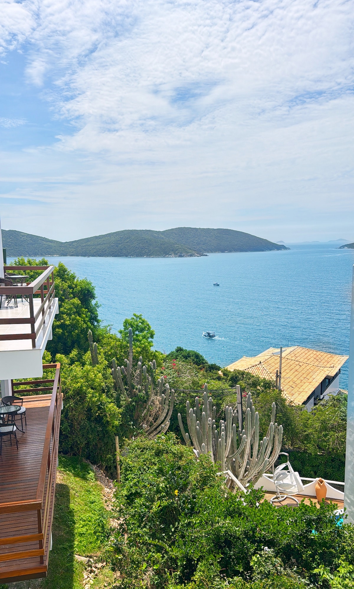 Дом с видом на море в Понталь-ду-Аталеа, главный район Арраял-ду-Кабу. Захватывающий вид, кондоминиум с домами в средиземноморском стиле. Дом состоит из: - люкса с двуспальной кроватью размера Queen size, кондиционером и телевизором SmartTV. - Американская кухня - Гостиная с двуспальным диваном-кроватью и телевизором SmartTV (без кондиционера) - Общественная ванная комната - Терраса с барбекю и столом.