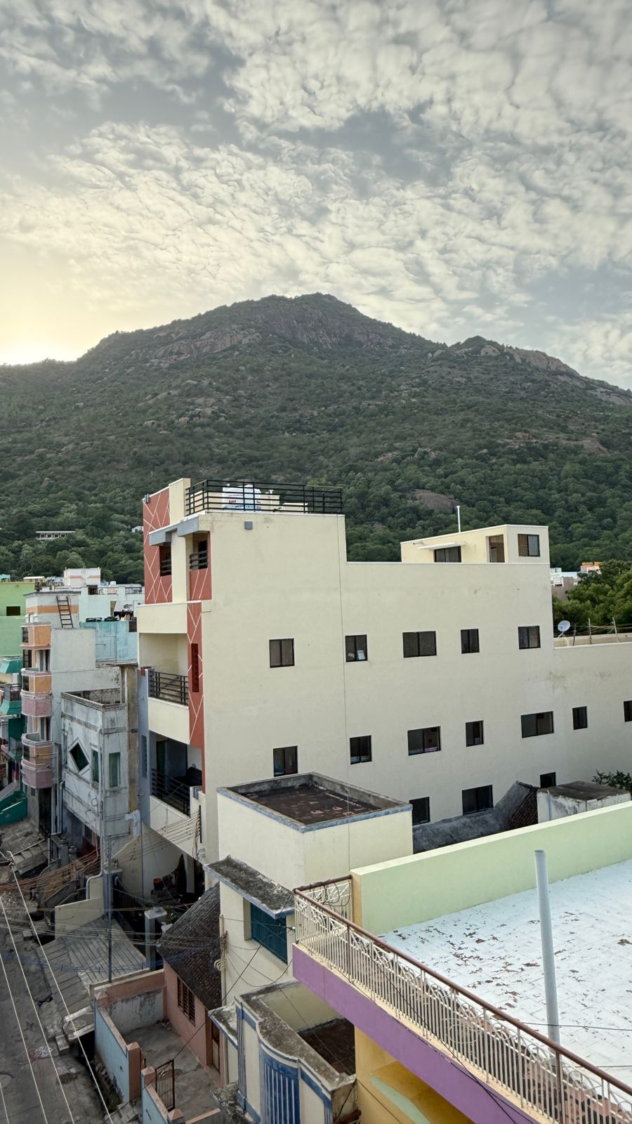 Find spiritual bliss in this 3rd-floor retreat, just 10 mins walk (600 Metres) from Sri Ramanasramam and Yogi Ramsuratkumar Ashram. Unobstructed, wide-glass views of Arunachala mountain offer a profound spiritual connection. Aesthetically designed with modern comforts and a bamboo sofa in corridor for meditation, a peaceful sanctuary in Tiruvannamalai. Only stairs to improve your health (No Lift)