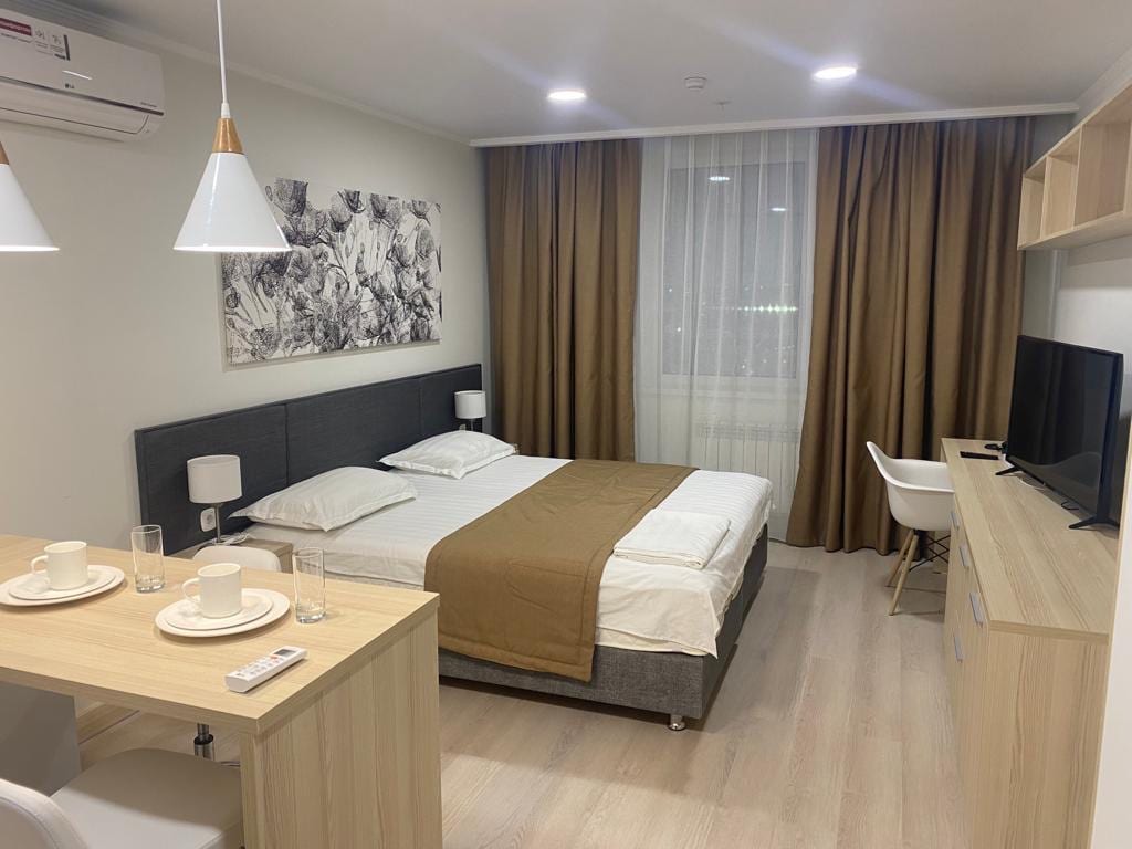 Наши апартаменты созданы для комфортного проживания гостей, которые ценят качество, простор и стиль. Что вас ждёт: • Светлые и современные номера с продуманным дизайном • Полностью оборудованная мини-кухня • Удобная кровать и качественное бельё гостиничного стандарта • Бесплатный Wi-Fi на высокой скорости • Тишина и абсолютный комфорт — подойдёт как для отдыха, так и для работы • Уборка для вашего удобства • Круглосуточная стойка ресепшн и безопасность • Локация