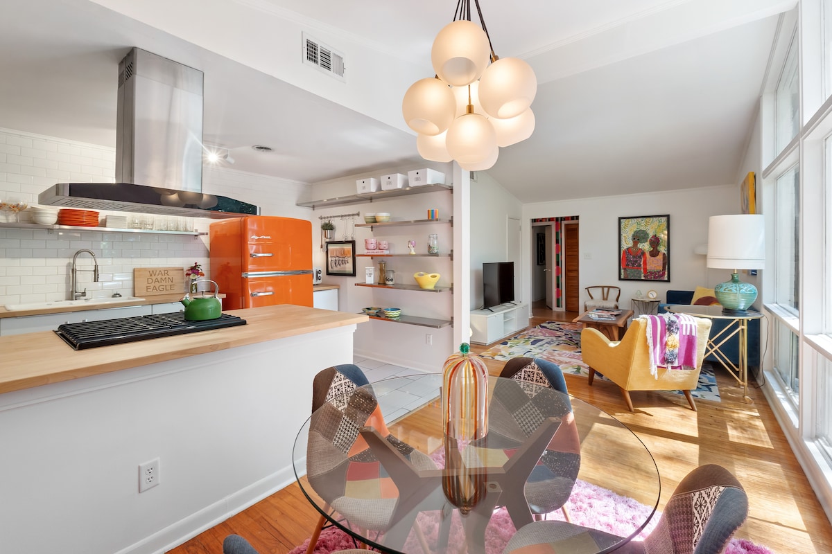 Добро пожаловать в The Big Chill, яркий дом середины века в Оберне, всего в одной миле от Тумерс-Корнер и центра города Оберн. В этом стильном доме с 4 спальнями и 2,5 ванными комнатами могут разместиться до 10 гостей. К услугам гостей две уютные гостиные, полностью укомплектованная кухня и обеденная зона на открытом воздухе с грилем под оранжевым навесом. В нескольких минутах ходьбы от Kroger, вниз по улице от местного любимого Acre и в нескольких минутах езды от Университета Оберна — идеально подходит для семей, групп и проживания в игровые дни. Мы верим в Оберн и любим его!