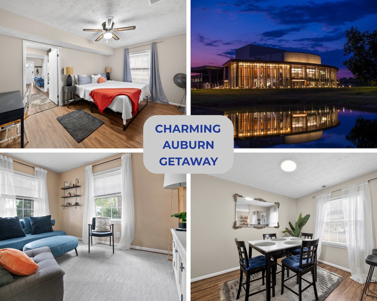 AULL INN - это частный таунхаус, расположенный на тихой улице всего в нескольких минутах ходьбы от центра Оберна. Наслаждайтесь уединением и спокойствием, всего в нескольких минутах ходьбы от оживленной ночной жизни города и кампуса Обернского университета. Негабаритные спальни, высокие потолки, большая кухня, уединенное заднее патио и телевизор с большим экраном делают это жилье идеальным местом для семей, друзей и деловых путешественников.