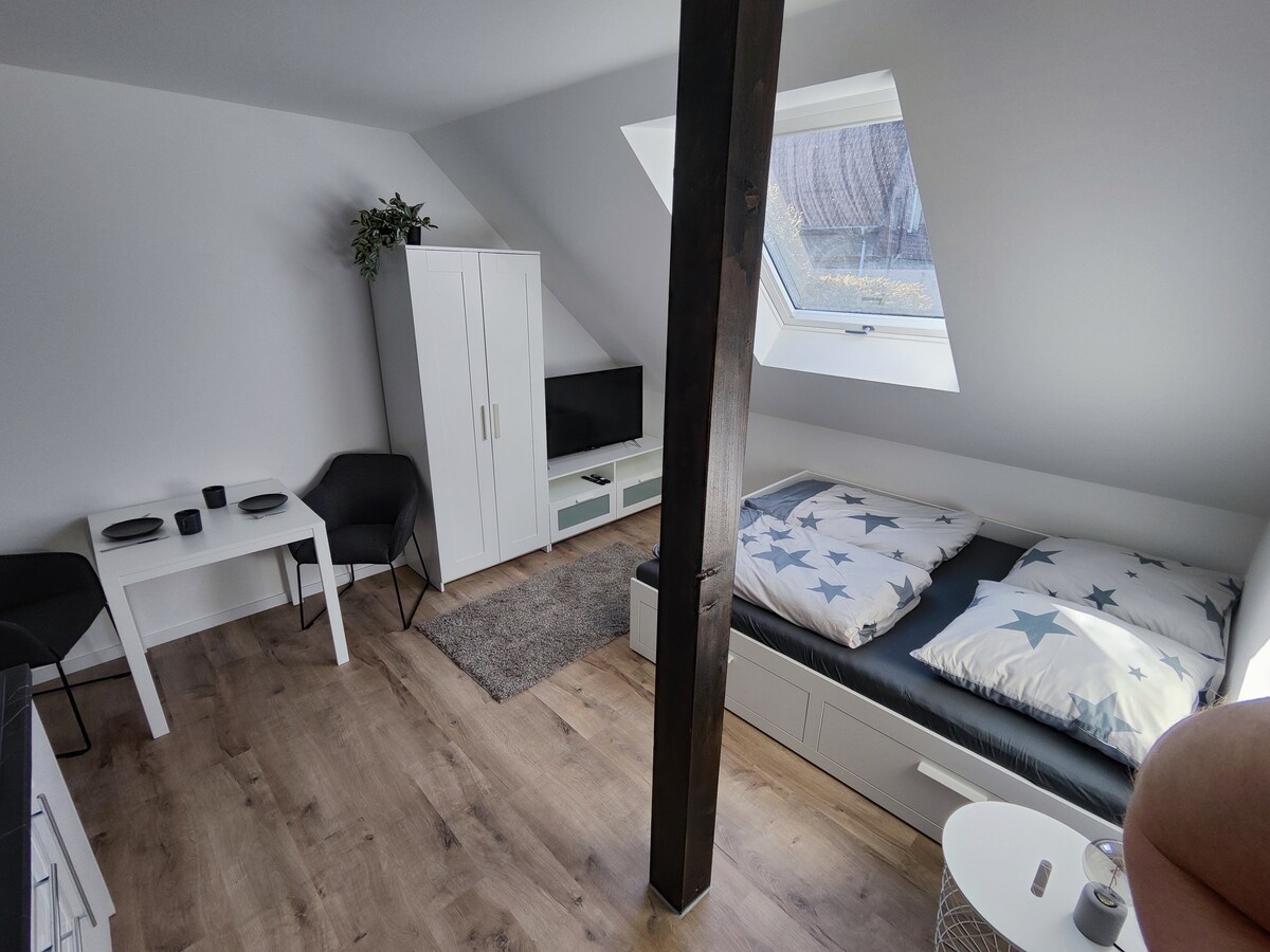 Полностью меблированная небольшая квартира в старом фермерском доме для одного или двух человек с отдельным входом и видом на коттеджный сад. Расположенная в тихом жилом районе, до нас легко добраться на общественном транспорте (2 километра от вокзала и университета). Главная комната (деревянный пол) оборудована небольшим столом, стулом, доступом к WLAN, телевизором, кроватью (1,40x2,00 м) с чехлами, креслом и шкафом . Мини-кухня оснащена плитой, холодильником, микроволновой печью, чайником, небольшим столом со стульями и т. д. Есть ровная ванная комната с душем и стиральной машинкой. Бесплатная и безопасная парковка рядом с домом. Вы можете пользоваться собственной террасой, стульями и столом. Пожалуйста, сначала свяжитесь с нами, если вы хотите забронировать жилье с декабря.