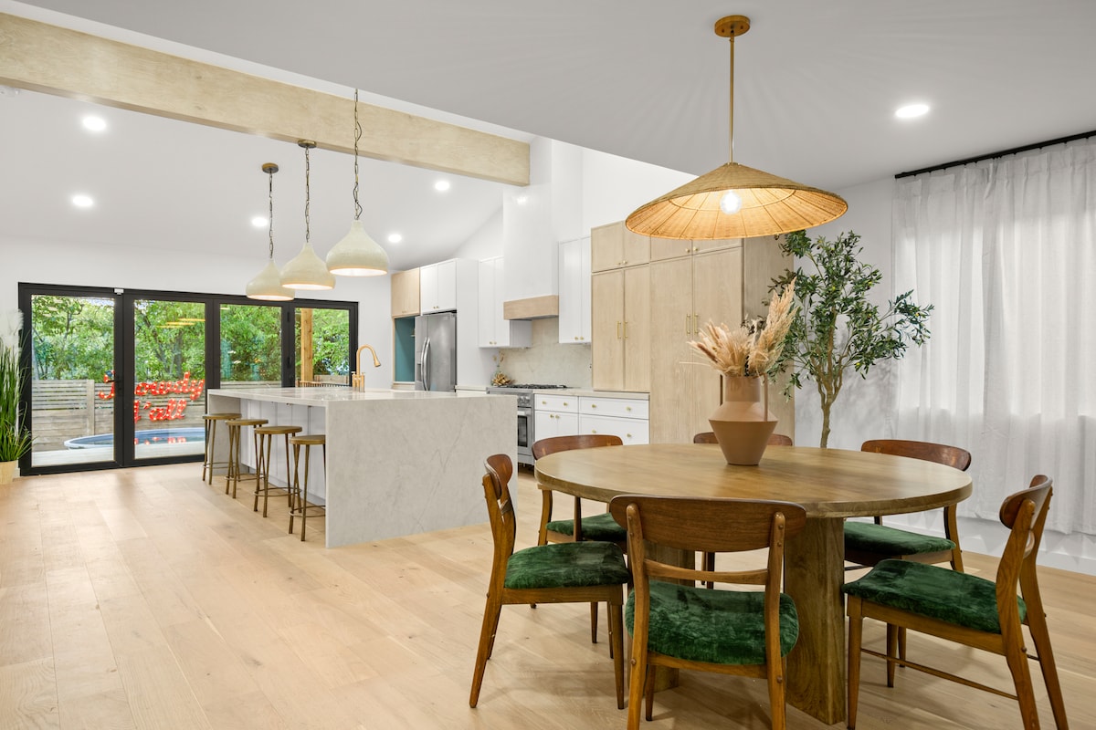 Welcome to our South Austin oasis—perfect for bachelorettes, family reunions, or group getaways! This newly renovated home is minutes from South Congress, Zilker Park, and Austin’s best dining and nightlife. Relax in the private hot tub, sauna, or 10-ft temperature-controlled cowboy pool—big enough for 8 adults. The backyard oasis includes fans, grills, comfy seating, and a Peloton, rower, and free weights. Inside, the open chef’s kitchen and modern design make this the ultimate ATX retreat.