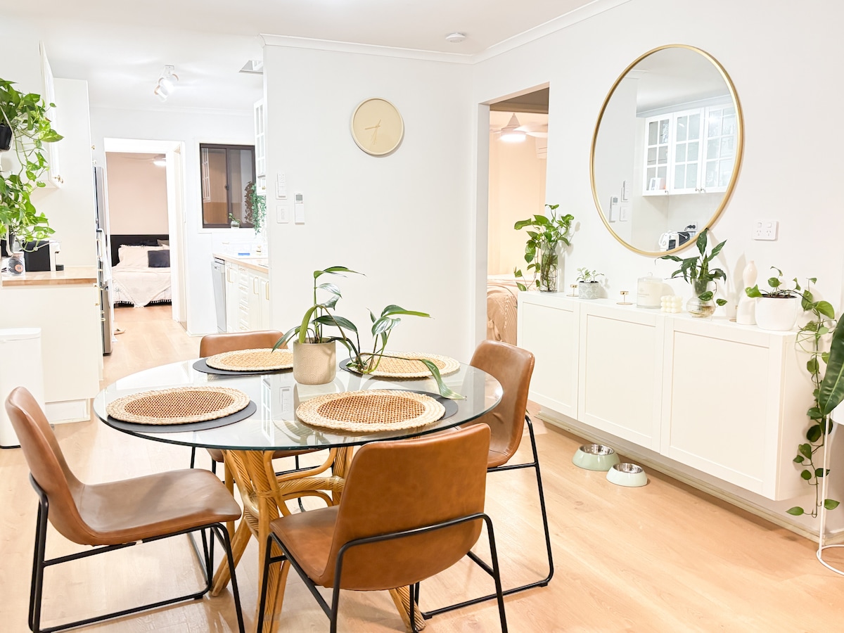Это почти новая, просторная, автономная и комфортабельная квартира на первом этаже. Она находится в 5 минутах езды от аэропорта и центра города, автобусная остановка в 50 метрах. Легко дойти пешком до парков, ботанических садов, центральных озер, тропических лесов, арт-центра Tanks, ресторанов, кафе и очень близко к модной деревне Эдж-Хилл и супермаркетам. Идеально подходит для 1 пары или друзей/семей/семей до 4 человек. В одной комнате роскошная кровать размера Queen size, в другой 2 односпальные кровати размера King size. Мы живем на первом этаже, но очень уединенно для гостей.