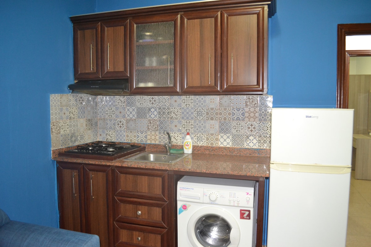Квартира с открытой планировкой высокого класса с полностью меблированной просторной террасой с панорамным видом (барбекю разрешено на террасе). В квартире есть двуспальная кровать или 2 односпальные кровати на открытой территории с гостиной. Полностью оборудованная кухня с посудой, микроволновой печью, газом, холодильником, прачечной. Он находится в 10 минутах от центра Бейрута и в 7 минутах от медицинского центра Bellevue. Завтрак предоставляется за дополнительную плату в размере 8 долларов с человека. Кошки не допускаются.
