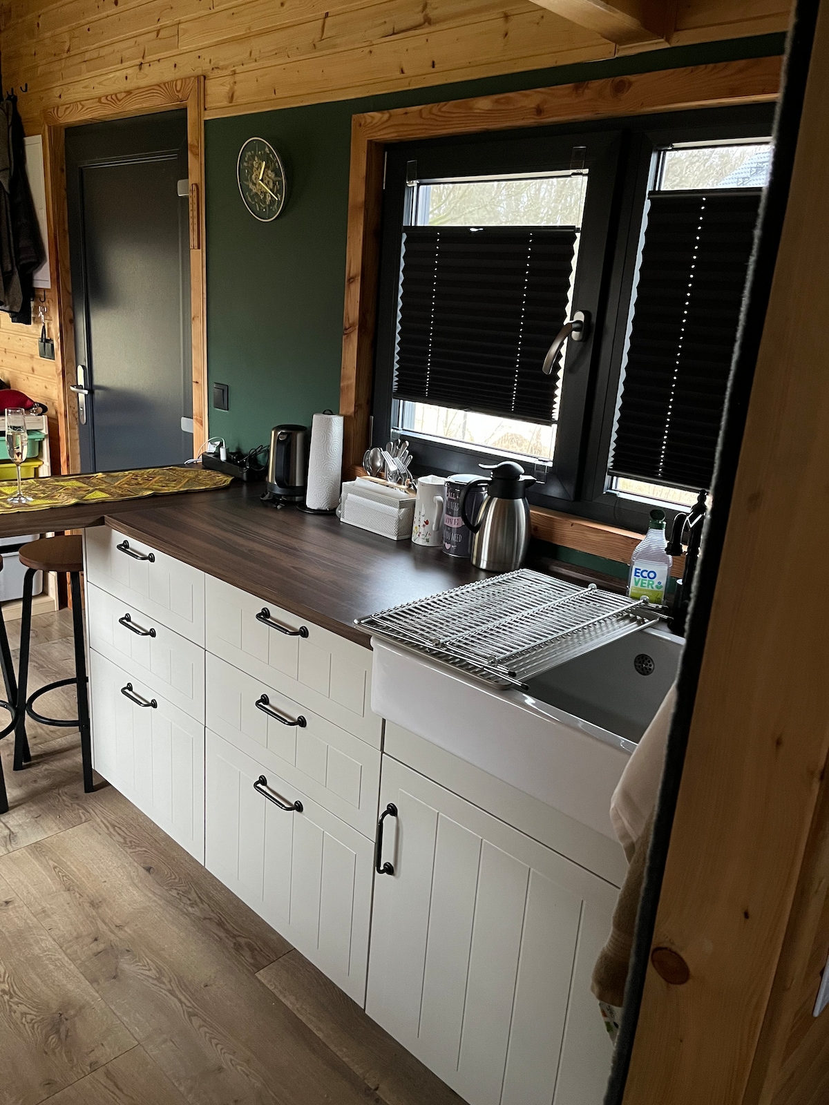 Take it easy at this unique and tranquil getaway. Escape to our tiny house for 4, just 1.5h by train from Berlin! With 2 cozy lofts, a fully equipped kitchen (small oven is part of a toaster,cooking on induction cooktop), bathroom with shower, it’s the ideal retreat. Relax by the indoor fireplace or gather around the outdoor fire under the stars. Surrounded by forest and a nearby lake, it’s perfect for hiking, swimming, or simply unwinding in nature.(there is no wifi connection!!)