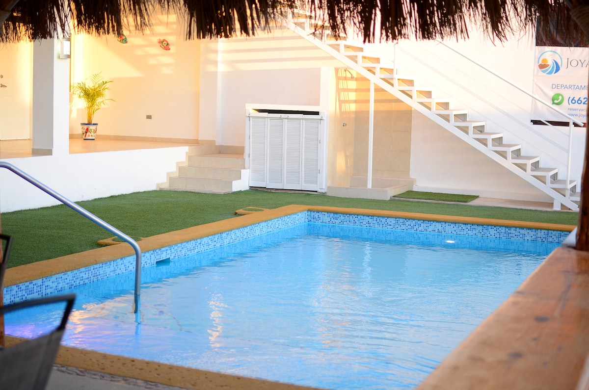 Расположенный в Joyas de Cortez Conjunto, в котором есть 3 другие квартиры (Obsidiana, Jade и Onix), мы предлагаем вам полностью оборудованное жилье для невероятного отдыха. ДОМАШНИЕ ЖИВОТНЫЕ ЗАПРЕЩЕНЫ. В ней достаточно места и приятный декор: -2 спальни, главная двуспальная кровать размера King size и вторые 2 двуспальные кровати -2 ванные комнаты - гостиная с 2 диванами, столовой и оборудованной кухней -2 Netflix SmartTV - стиральная машина и сушка для одежды - Интернет - Терраса с барбекю - Парковка.