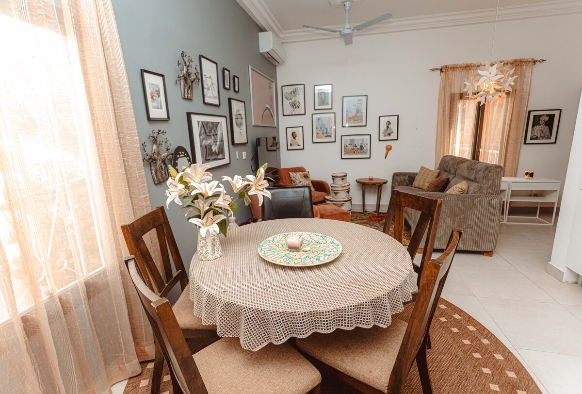 Afro-Chic Apartment in Senegambia Stunning 2-bedroom apartment 300m from the beach, decorated in Afro-chic style with locally crafted furniture. Near the conference center and top restaurants. Fully equipped kitchen (microwave, fridge, Nespresso), AC, Netflix, high-speed fiber, pool, kiddie pool, washing machine, generator. Bathroom with towels, shampoo, shower gel. 24/7 security, cleaning included. Coffee, tea, water provided. Perfect for business or leisure, book for a unique stay!